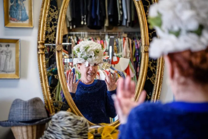 Robin Woods tries on a hat at Connie’s Vintage Trunk this past March. NEIL GRABOWSKY/ MONTCLAIR LOCAL